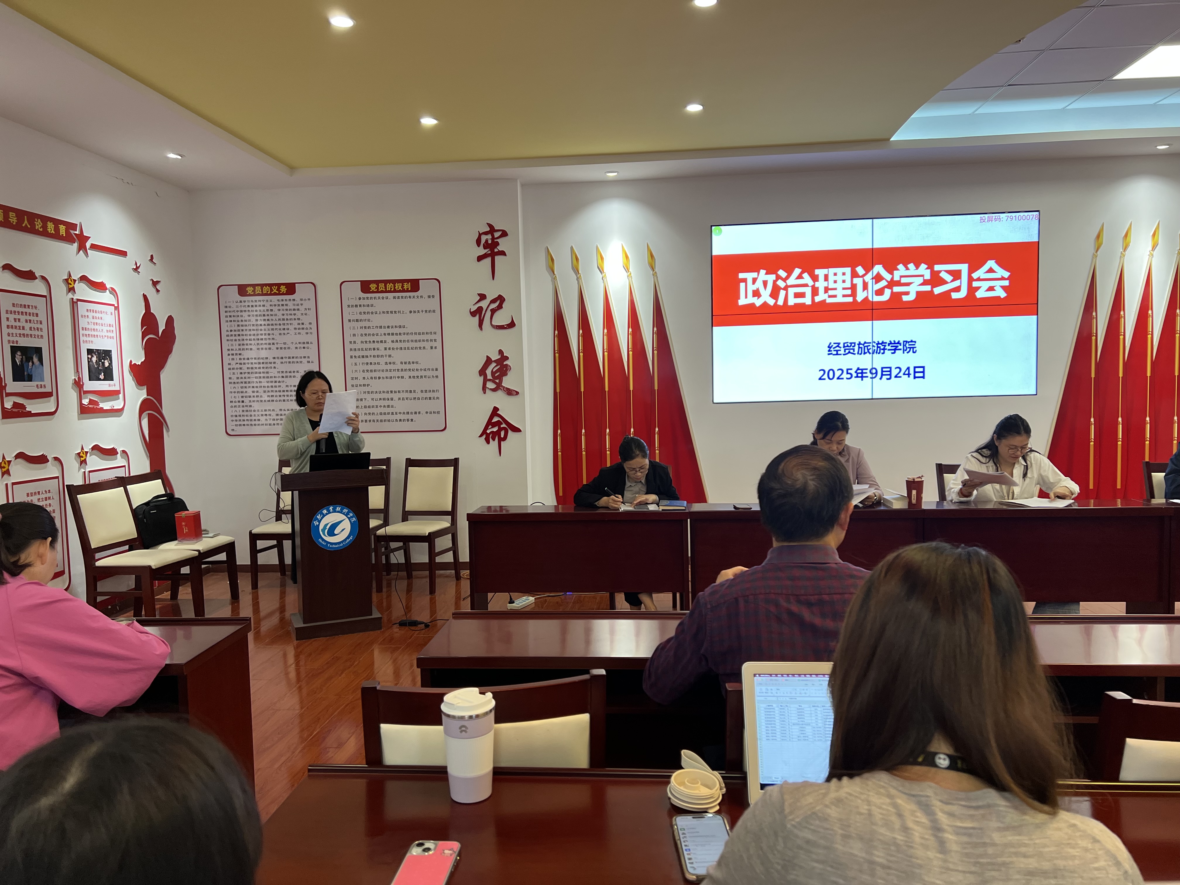 9月24日下午,best365官网在党性体验馆召开政治理论学习会暨教职工大会,全体教职工参加会议,会议由副经理付晓兰主持。
