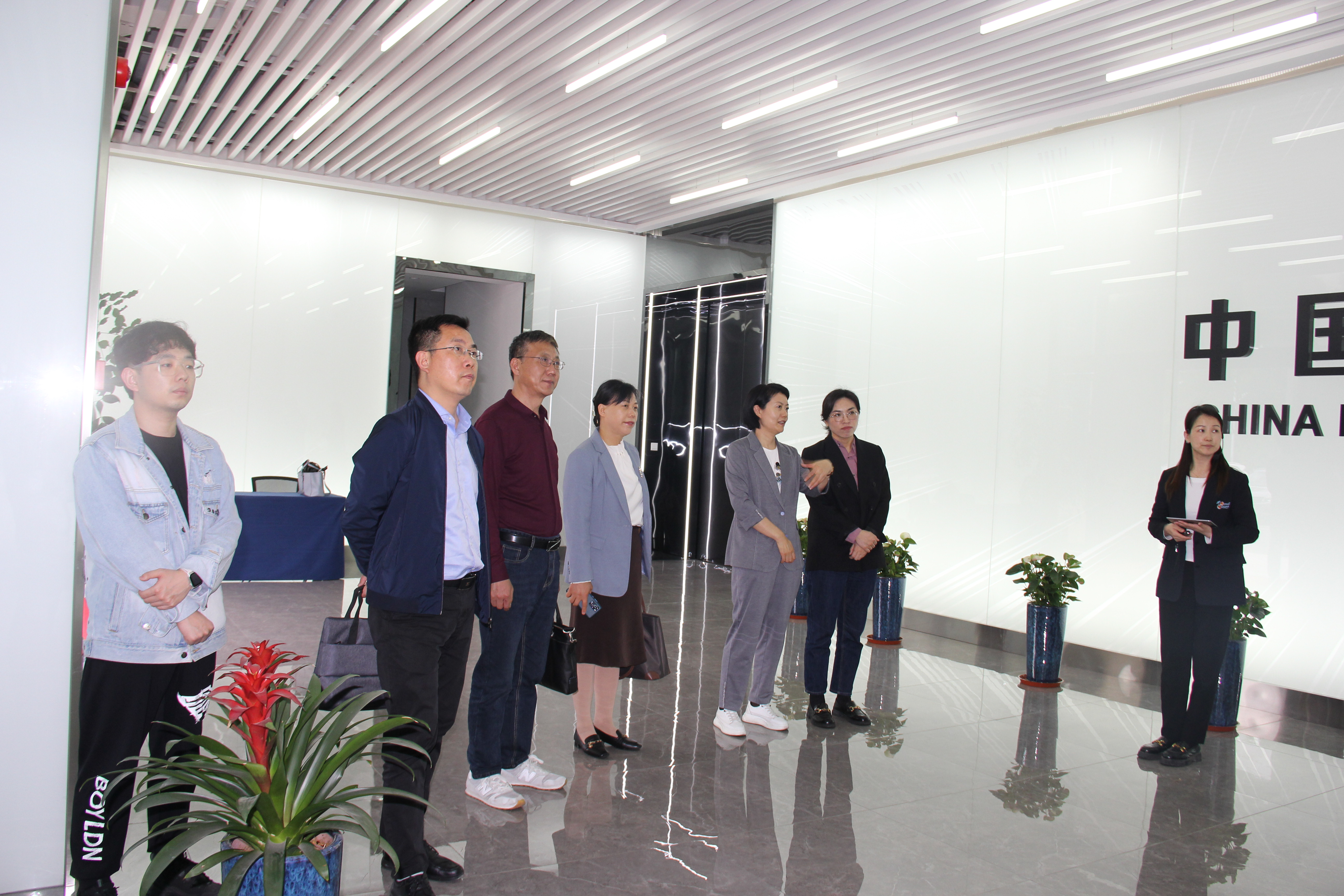 调研中,公司一行来到中国网谷展厅,在许波等带领和讲解下,大家观看了企业光影宣传片并参观展厅长廊,感受中国网谷前沿科技的梦幻魅力、充分认识其“一谷三基地”产业承载平台的战略布局和发展前景。