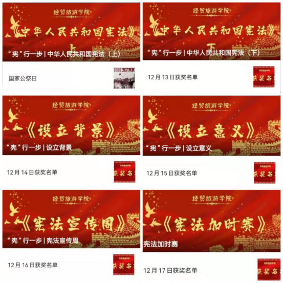 此次宪法学习有奖答题活动分为两个阶段。第一阶段,12月13日至12月17日,为期五天的宪法知识学习,公众号每日推送一篇宪法知识内容,每日20题,学习宪法基础知识,增强守法、知法意识。第二阶段,12月18日,历经了5天的基础知识学习后,开启最终较量——宪法知识有奖竞答。参与的同学都有在线礼包赠送,3名优胜者还获得特别的奖品。这种新的学习形式赢得了众多师生更积极的参与,有奖竞答当天参与人数就有1000多人。