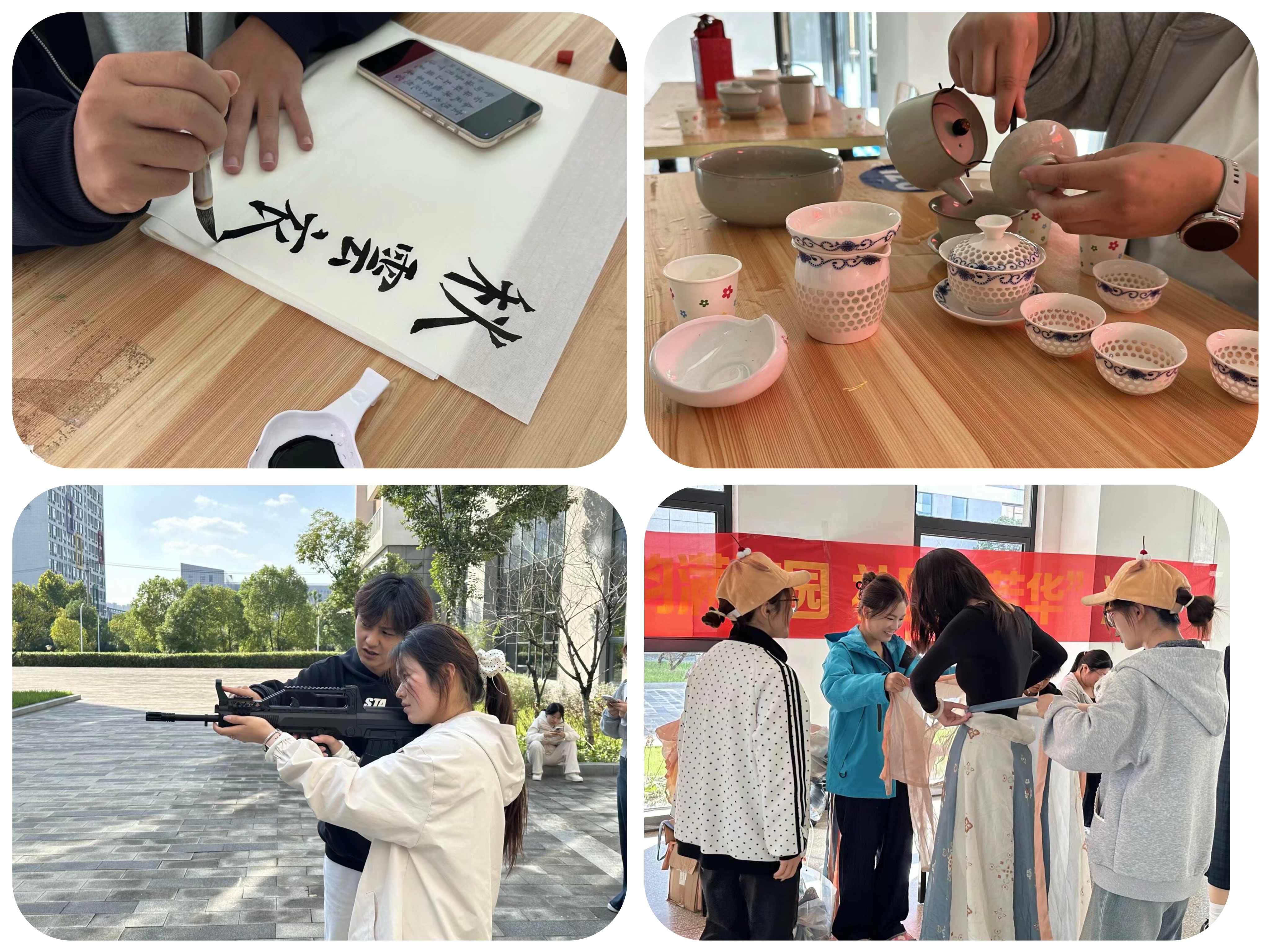 图南国学社打造的“国风体验区”吸引了众多员工驻足。书法展台前,社员挥毫泼墨,进行专业示范,同学们纷纷提笔临摹,淡淡墨香与校园桂香交织;汉服体验区里,襦裙、褙子等传统服饰吸引众人试穿,社员讲解服饰形制与文化内涵,身着汉服的身影翩然漫步,成为校园里一道流动的雅致风景;香茗区中,茶艺表演行云流水,同学们捧杯细品,感受传统茶文化的韵味。