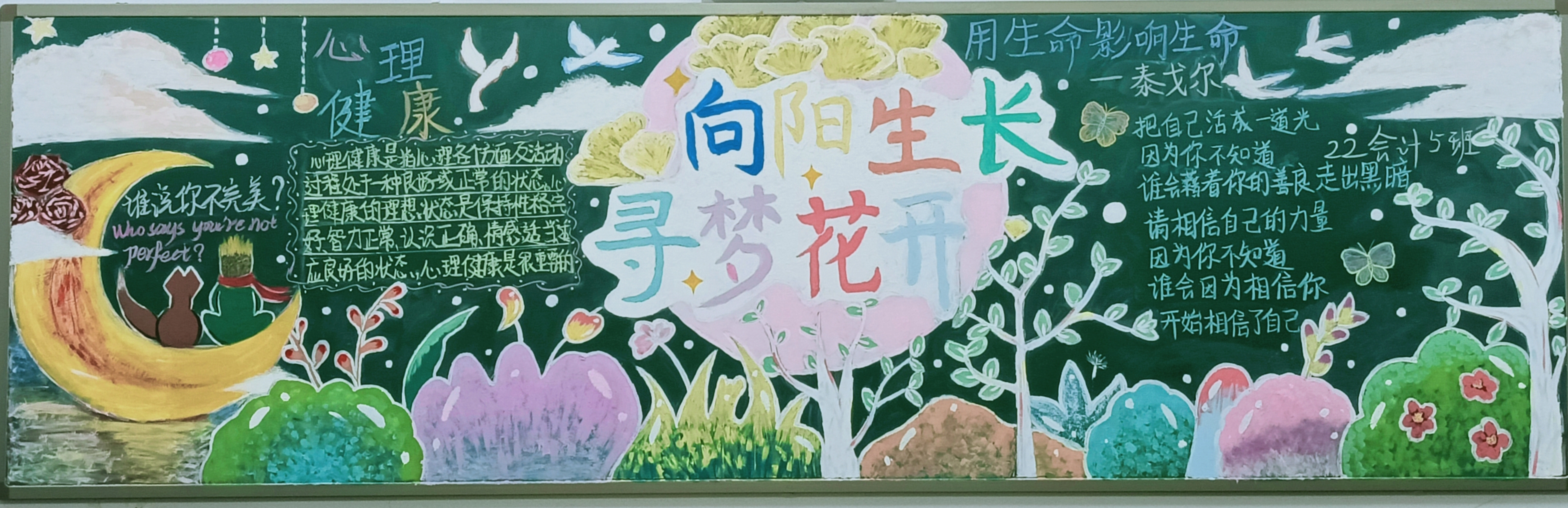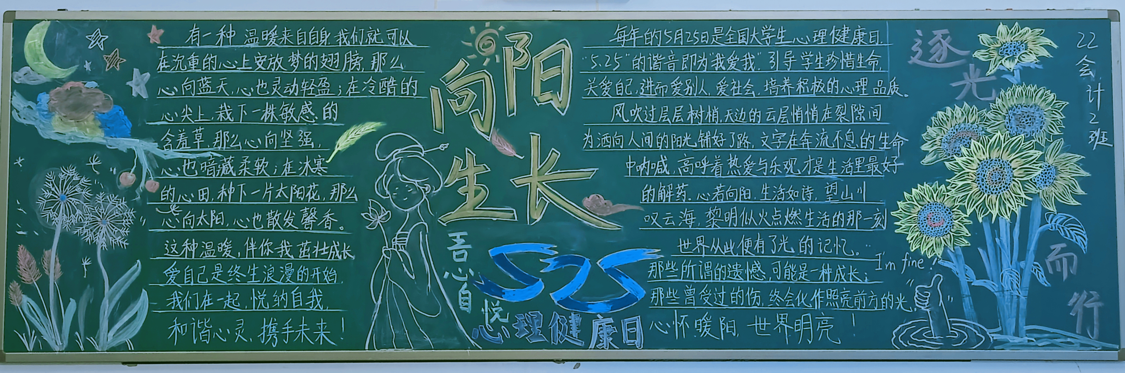 为了更好地宣传普及心理健康知识,让员工树立正确的心理健康观念,努力提高员工心理自我调节能力。5月15日至28日,best365官网在2022级各班级开展了“心向阳光,青春绽放”为主题的心理健康教育主题黑板报评比活动。