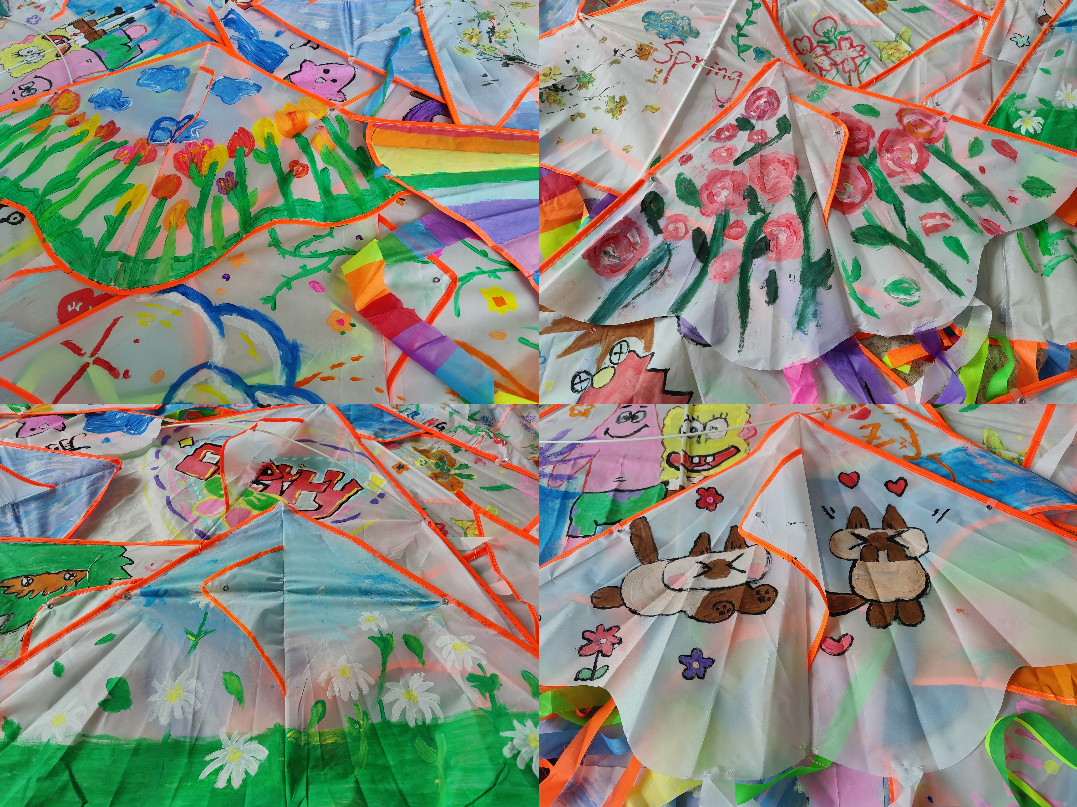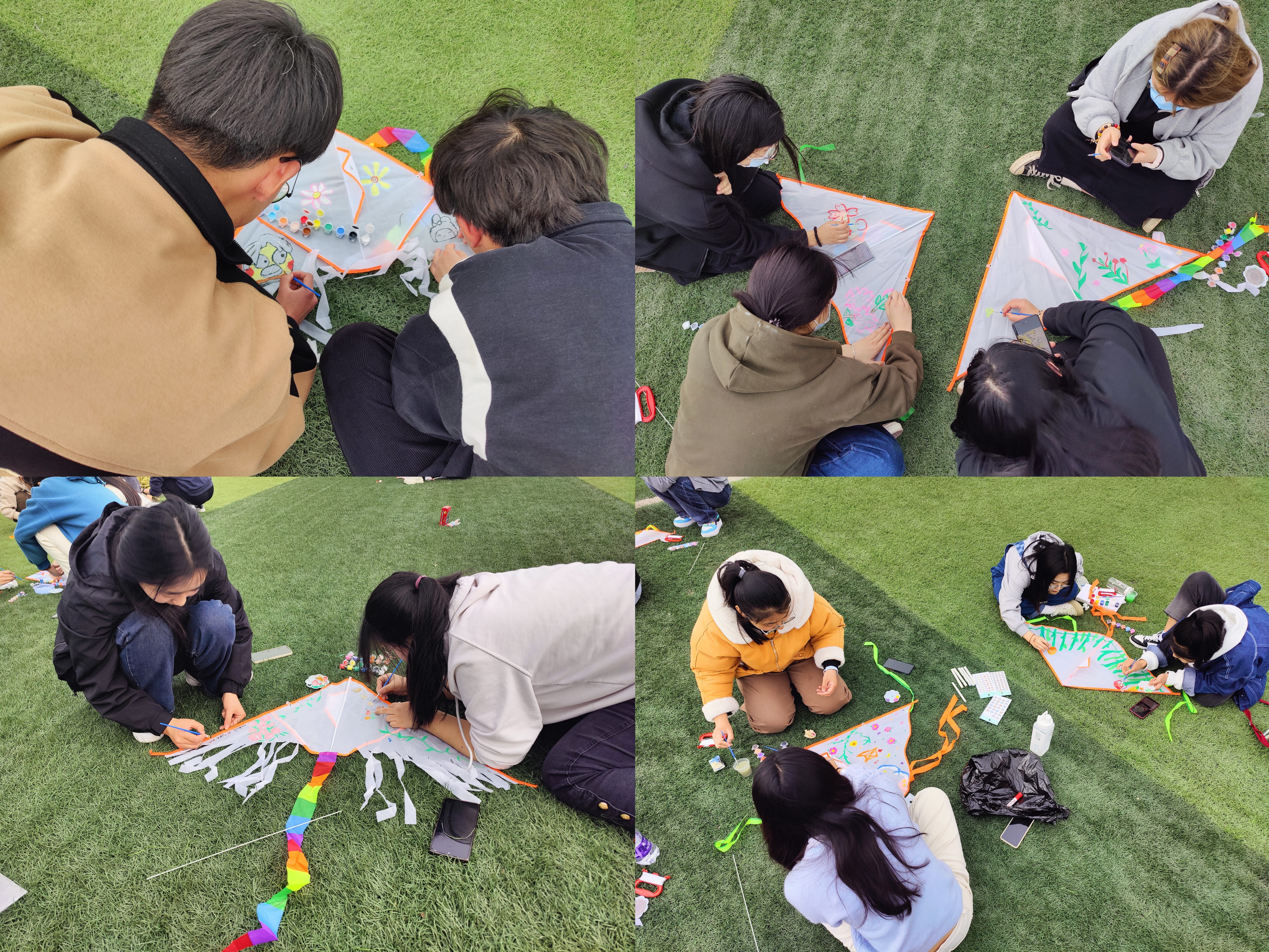 本次活动有两种参与方式,两人组队和以宿舍为单位的四人组队。活动现场,公司志愿者提前准备好活动的材料,参加的同学有序领取风筝后纷纷在足球场上席地而坐,齐心协力开始在风筝上以“花young世界,与你分享我的春天”主题进行绘画。一朵朵五颜六色的花,在操场上绽放,大家脸上也荡漾着笑容。