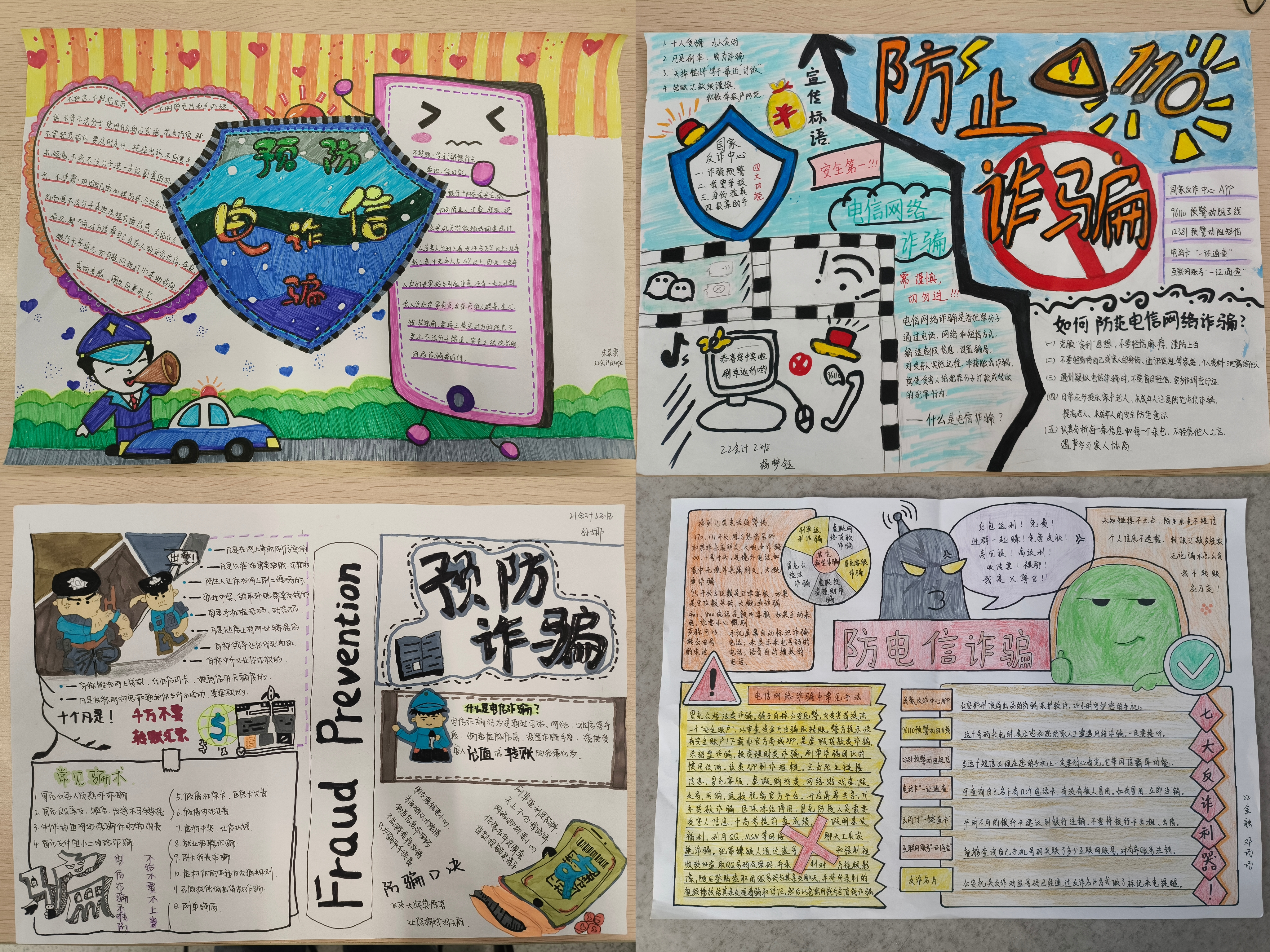 各班同学积极参加活动,主题明确、设计新颖、图文并茂,紧紧围绕公司、社会、生活等方面可能出现的诈骗形式进行创作。参赛作品详细分析了典型诈骗案例,形象地介绍了网络诈骗的危害以及如何防范电信网络诈骗,直观的将防诈骗理念融入到手抄报中,提高了同学们预防诈骗的能力。