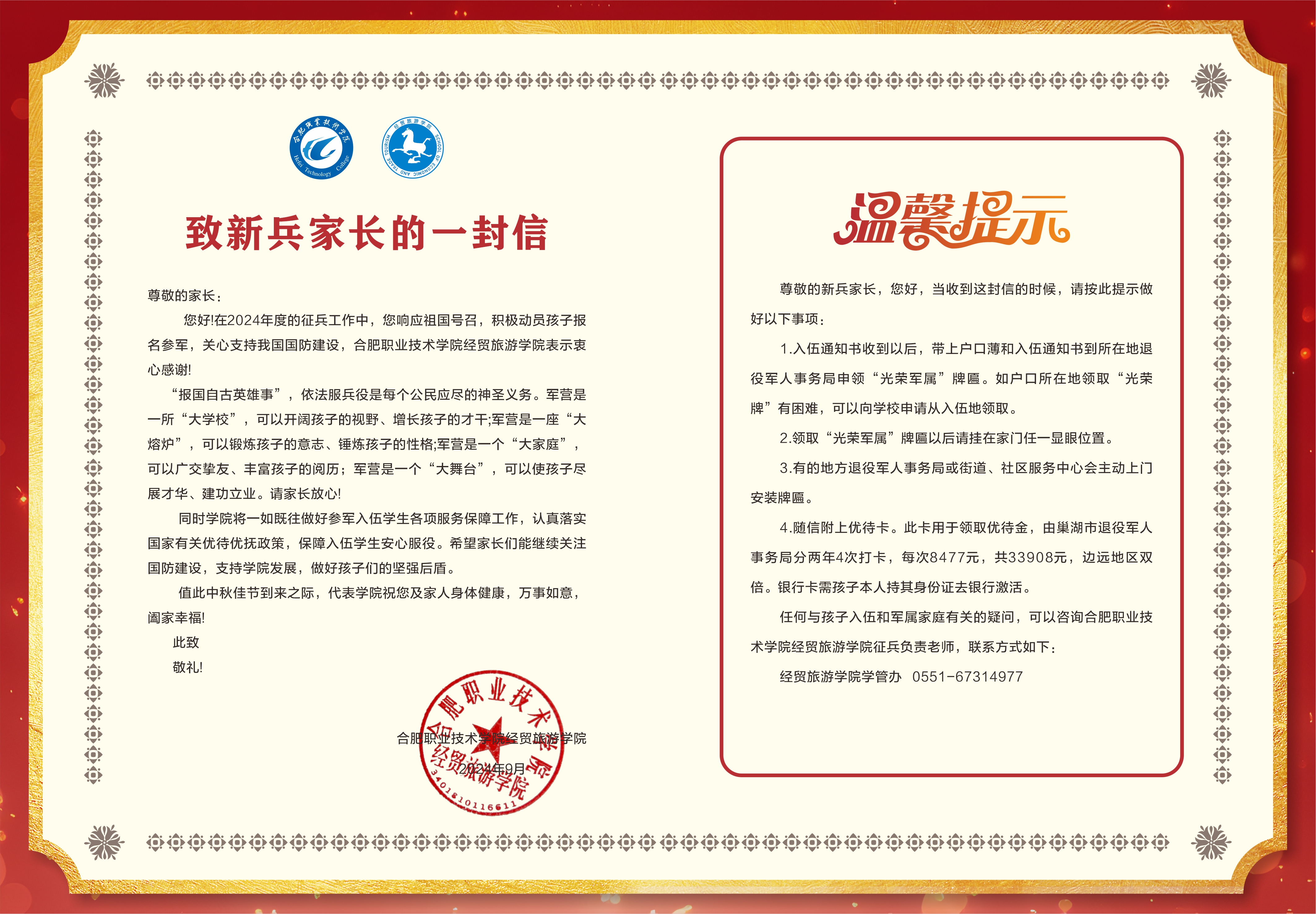 在慰问过程中,3名入伍员工的辅导员先在电话中热心询问新兵入伍后的思想情况和家属的生活情况,鼓励孩子在部队安心服役,积极表现,争取建功立业,报效祖国,为家庭争光,为公司添彩;将入伍员工学费补偿代偿、升学就业等优待政策告知员工家长。公司负责征兵工作的老师后续会通过邮寄的方式,将新兵的入伍通知书、优待卡寄到各个家庭,并附贺信送上节日祝福。