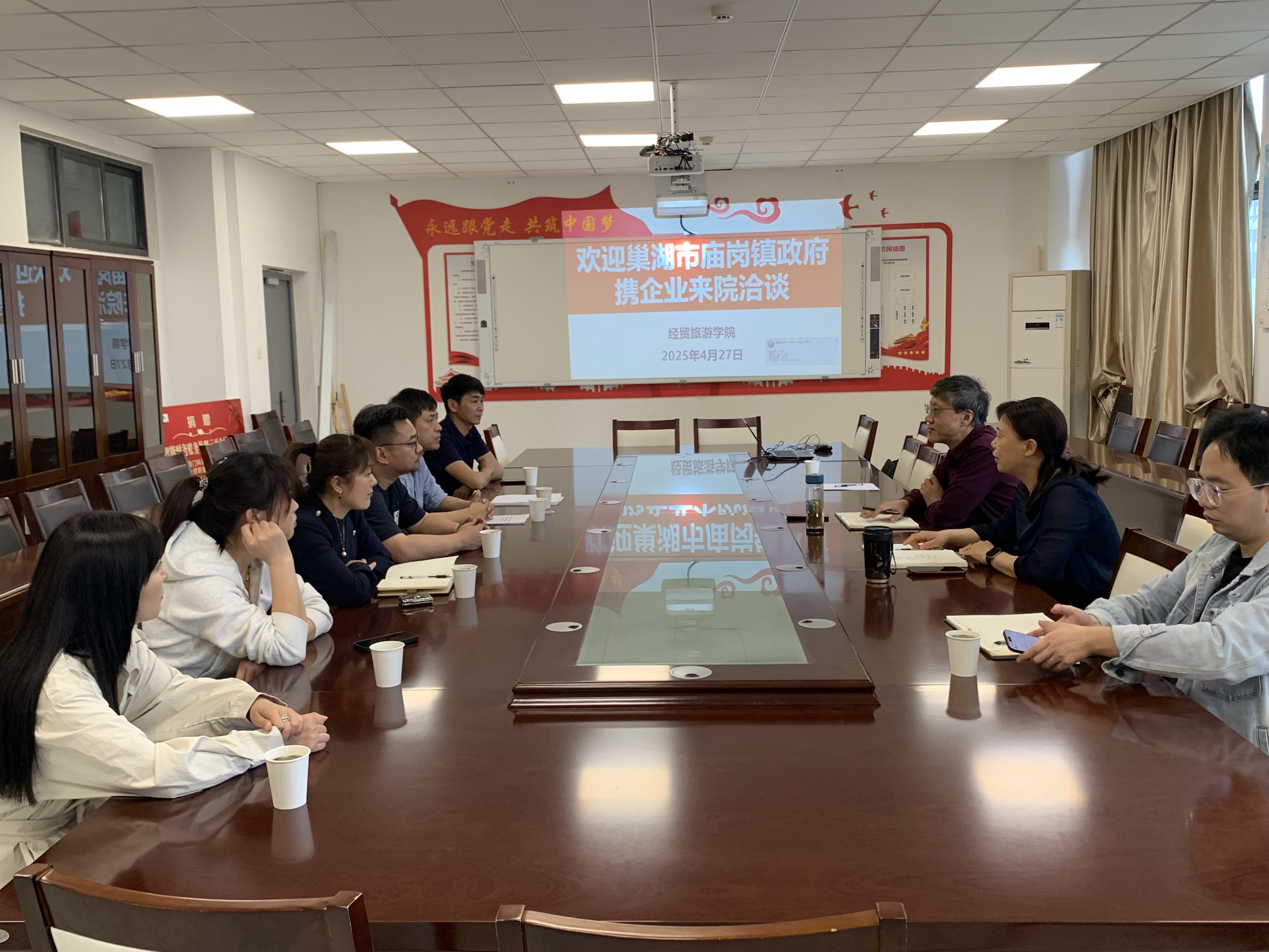 公司党总支书记梅亚松、经理赵红代表公司向代表团表示欢迎,并介绍公司在酒店管理、旅游管理、电子商务等学科的优势资源。赵红表示,公司始终将员工和教师发展做为中心,服务地方发展为使命,通过“产学研用”一体化模式,搭建师生实践平台,助力庙岗镇打造乡村振兴示范样板。双方围绕老员工实习就业、乡村振兴工作站共建等议题展开讨论,初步拟定合作框架协议,计划通过定期会商、项目清单化管理推进落实。